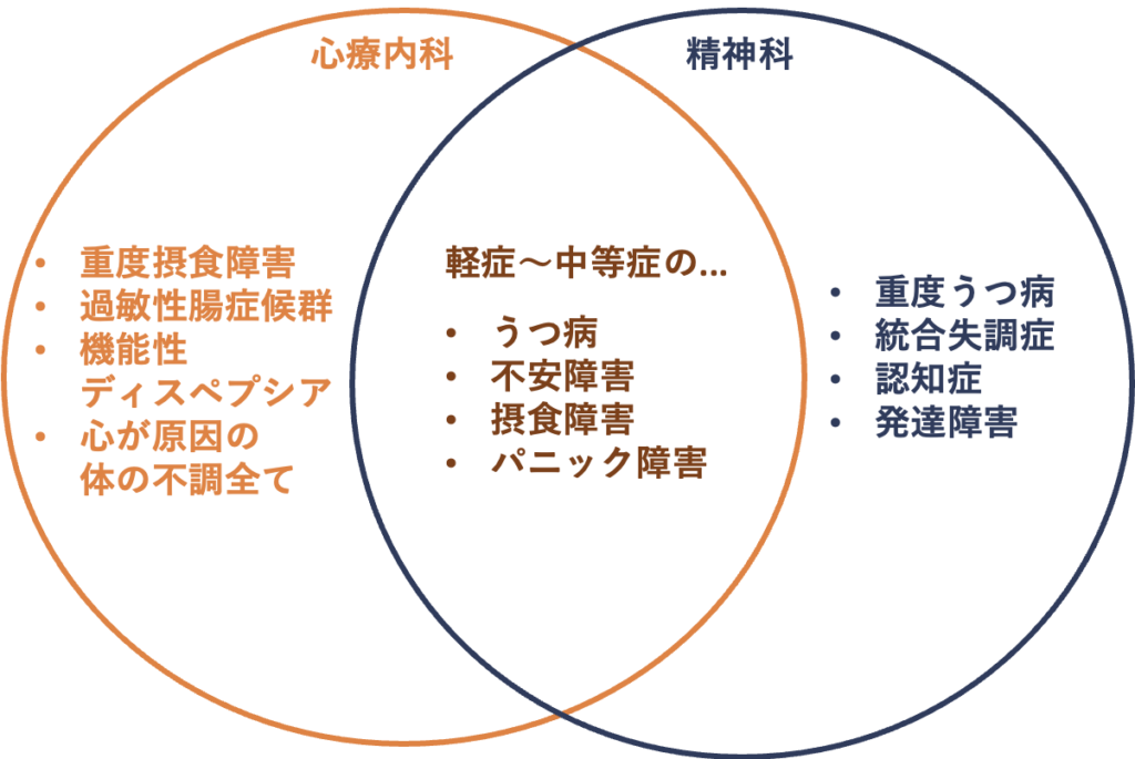 これは自分が作った心療内科と精神科がそれぞれ対応可能な病気をまとめた図です。
